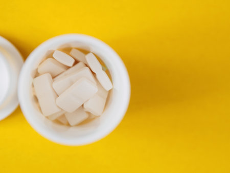white tablets in plastic container. top view