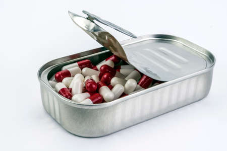 Tin metal contains white pills and red