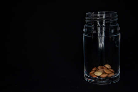 Capsules with the drug are poured out of a glass jar. Oral medications.