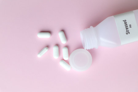 Stressed pill in white bottle, pill stock, medical or pharmacy concept
