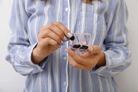Woman holding pill organizer box with activated carbon on light background