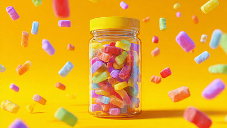 Colorful candies falling in a glass jar on a yellow background