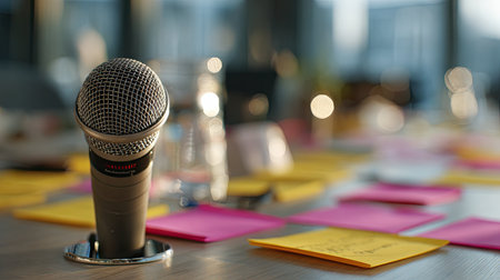 A professional microphone positioned on a modern office table surrounded by colorful sticky notes, symbolizing creativity and effective communication.