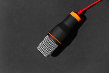 The microphone connected with cable on abstract blurred of light in the studio, speaking conference hall light or podcast recording. Event Background. Copy space on the left.