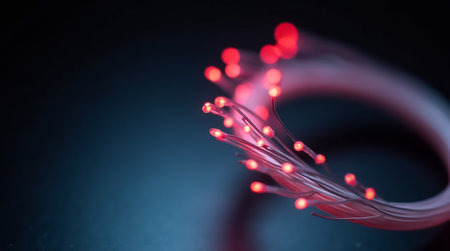 Close-up image of illuminated blue fiber optic cables against a dark, blurred background with bokeh light effects. The glowing fiber ends emphasize the concept of light-based data transmission, representing cutting-edge technology in telecommunications, internet infrastructure, and digital connectivity. Ideal for use in tech-related projects, websites, presentations, and promotional materials focused on innovation, speed, and modern communication systems