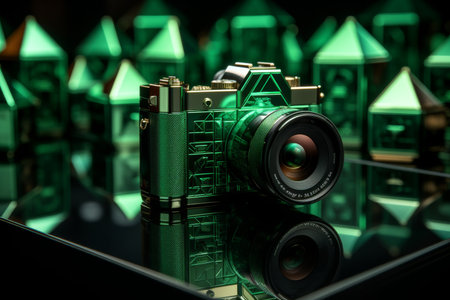 Vintage camera on a black background, close-up, selective focus