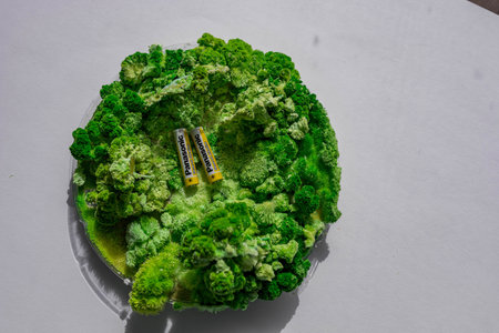 Alkaline batteries on green background, top view