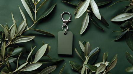 Keychain on green background with olive leaves, nature concept