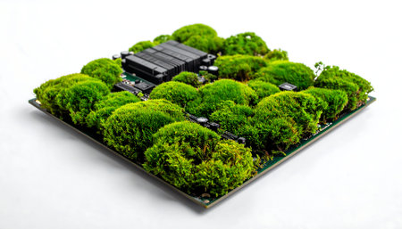 Close up of green circuit board surrounded by lush plants symbolizing nature and technology fusion