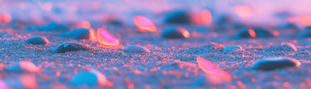 Small pebbles illuminated with neon red highlights on sandy beach for vibrant backdrop