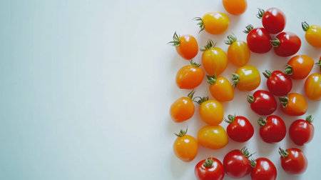 There is a vibrant and colorful pattern of fresh tomatoes displayed beautifully against a clean, crisp white background, enhancing their appeal