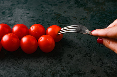 hand string tomatoes with a fork. High quality photo