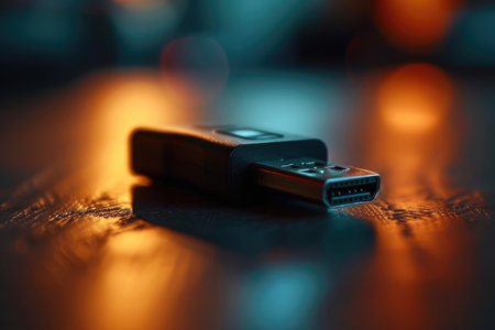 A gold and black USB connector rests on a dark surface. The connector shows its port and shape clearly. Light reflects off the metal, creating highlights that enhance its design.