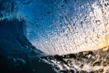 View in barrel wave with sunrise tones. Breaking ocean wave
