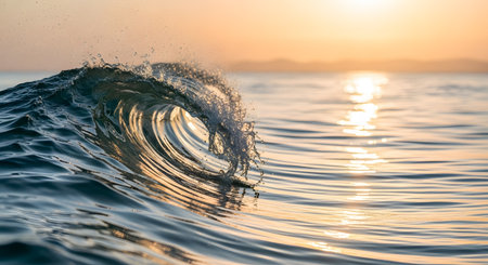 A small, perfectly formed ocean wave curls and breaks, beautifully reflecting the golden light of a setting or rising sun. This serene and tranquil seascape captures a peaceful moment of nature's beauty in intricate detail.
