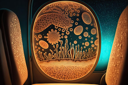a microscopic view of bacteria on the seat of a bus, with its intricate structures visible, created with generative ai