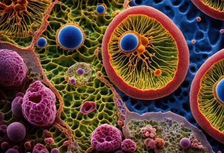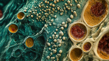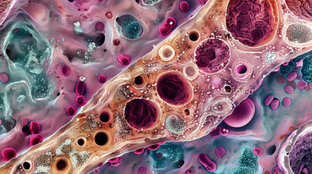 A close-up visual reveals diverse cellular structures with vibrant colors and textures, showing intricate biological details under a microscope.