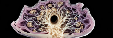 Stylized cross section showing diverse anatomical structures with labeled cells, tissues, and fluids for clear educational purposes.