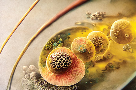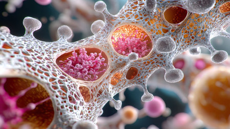 An artistic depiction showcases intricate cellular structures and interconnected organelles in a vibrant microscopic setting, highlighting biological diversity.