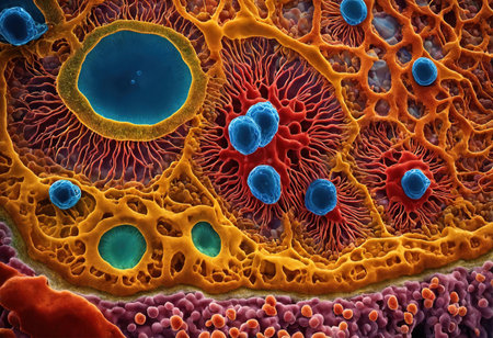 Explore a detailed microscopic view showing vibrant cells and unique structures that illustrate complex biological interactions and forms.