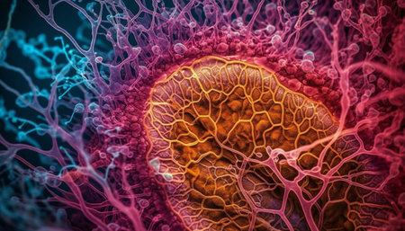 Discover a vibrant abstract microstructure showcasing cells and biological elements, illuminated with stunning colors and intricate patterns that evoke creativity.