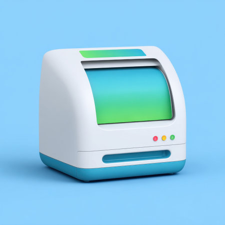 This image features a retro-inspired compact printer with vibrant colors set against a soft blue background, perfect for modern design themes and creative projects.