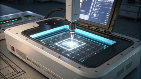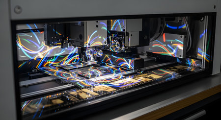 Advanced technology equipment is shown with bright LED lights highlighting intricate circuits and components, illustrating precision in design and function.