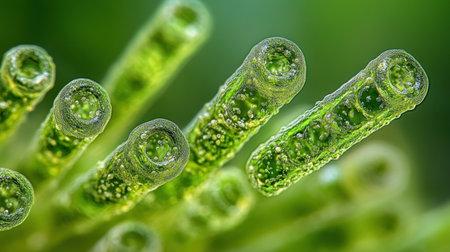 Captivating close-up of green algae cells displaying intricate bubble-like structures, showcasing the beauty of microscopic life in a vibrant natural setting.
