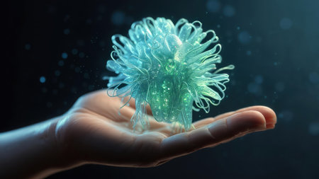 This stunning image features intricate microorganisms suspended in a futuristic blue environment, representing scientific innovation and research.