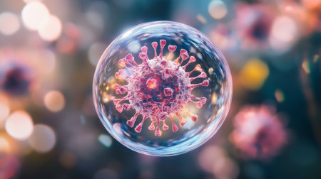 Microscopic view of coronavirus particle, colorful scientific illustration. Medical research and virology concept