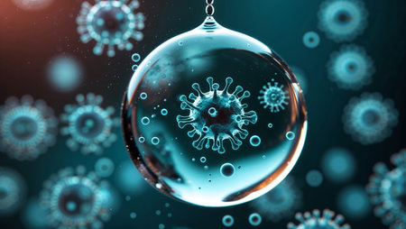 Microscopic viruses float in droplets of water, showing their intricate structures and magnifying concerns regarding health and safety.