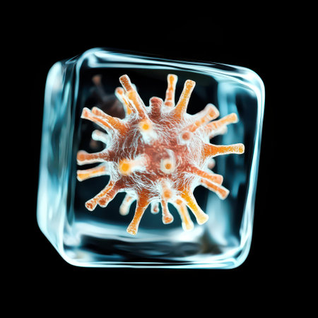 Virus trapped in ice cube, microscopic view.