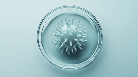 High-angle view of a single 3D model of the monkeypox virus in a petri dish on a blue background. Represents viral study and infection.