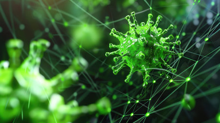 This image features a close-up view of a green virus depicted against a backdrop of abstract digital connections, emphasizing the intersection of biology and technology.
