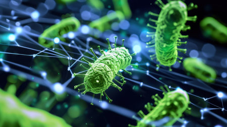 A detailed magnification of vibrant green bacteria suspended in a dark digital space, illustrating microbial activity and scientific research potential.