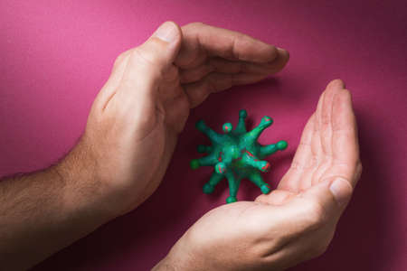 Human hands and toy coronavirus. Concept on the topic of artificial fight against the virus