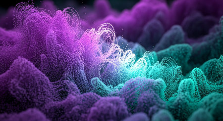 This abstract presents organic, cloud-like forms composed of countless glowing particles in shades of purple and teal. The particles create a luminous, ethereal texture, resembling a cosmic nebula or bioluminescent organisms. The soft focus and depth of field enhance the sense of otherworldly beauty and gentle movement. The vibrant color gradient and the interplay of light and shadow create a and futuristic visual experience.