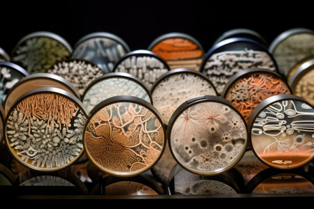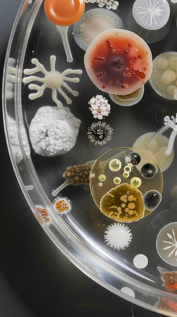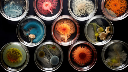 microbial cultures and petri dishes arranged in beautiful, artistic arrangement, created with generative ai