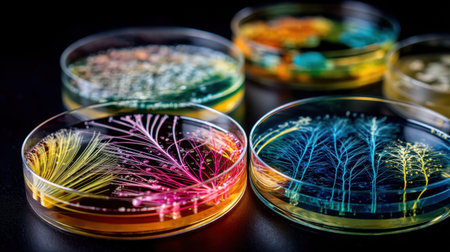 Vibrant and colorful petri dishes filled with various cultures demonstrate scientific research in a modern laboratory setting. Each dish reveals microbial growth.