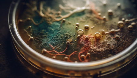 close-up of vibrant bacteria colonies on a petri dish, created with generative ai
