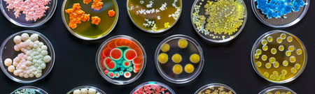 Various colorful bacterial cultures in petri dishes. Scientific experiment in microbiology. Concept of science, biology, laboratory research, medical studies.