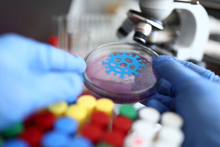 Male chemist hand in blue protective gloves hold petri dish closeup background. Medical lab research antivirus concept