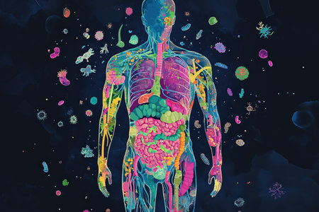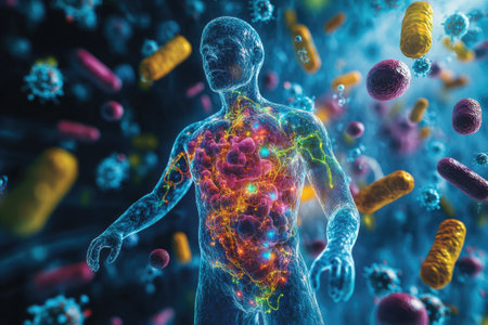 Human body diagram showing anatomy and internal organ systems surrounded by microbes and bacteria on dark background for medical science