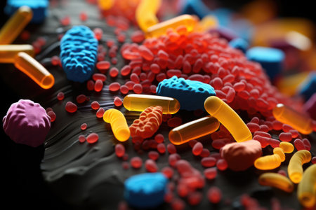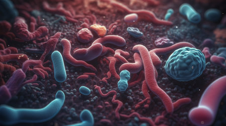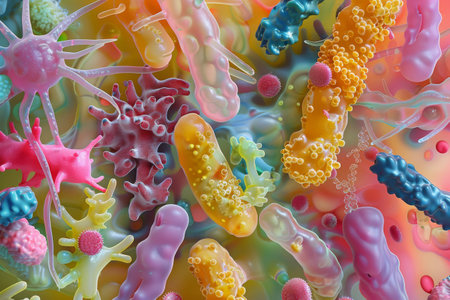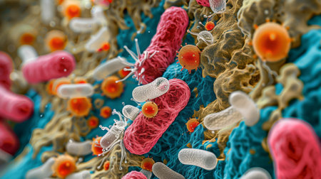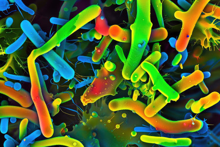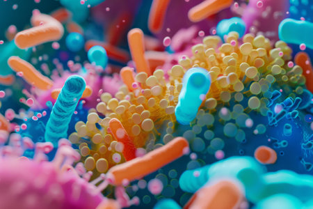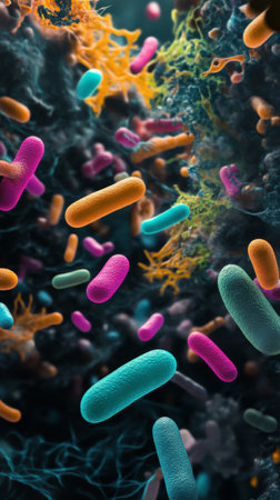 Colorful microscopic view of diverse bacteria thriving in a vibrant microbial environment
