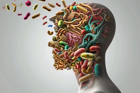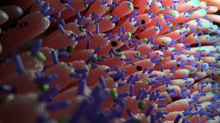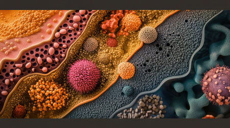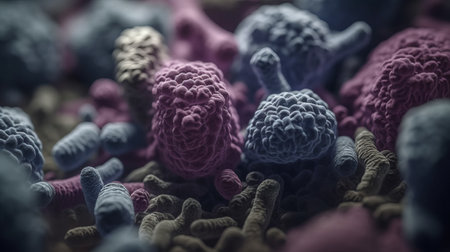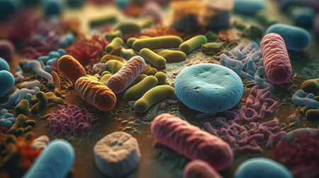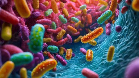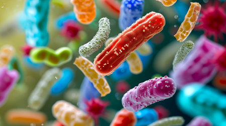 Microbiome bacteria probiotic gut. Conceptual representation of diverse bacteria composing human microbiome, illustrating gut health, science and modern wellness trends.