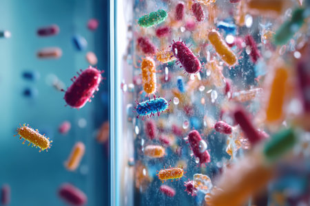 Colorful microscopic view of bacterias. Various shapes and vibrant colors in a biological scene