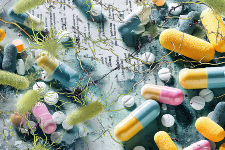A vibrant collage presents bacteria crawling over prescriptions, illustrating the relationship between pharmaceuticals and microbial life in a creative manner.