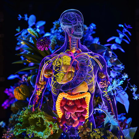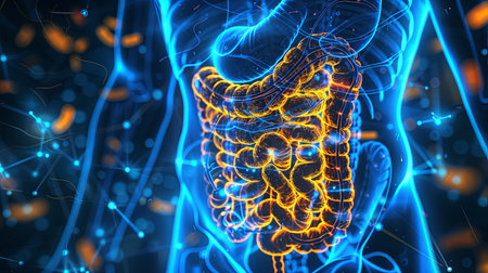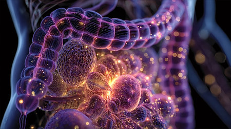 Golden particles are being generated by colon and intestines, creating a magical and healthy environment inside human body