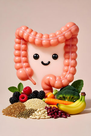 Detailed 3D cross-section shows the intestine interacting with a probiotic pill as it releases beneficial flora, highlighting digestive health.