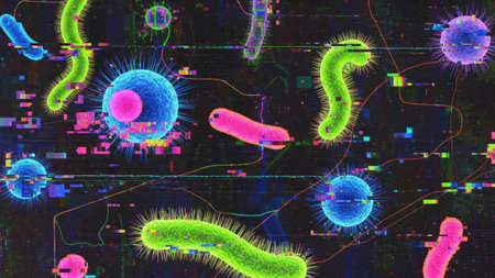This image presents a vibrant, digital depiction of various microorganisms. The composition features diverse shapes and colors, including green, blue, and pink elements against a dark background. The style suggests a futuristic or scientific visualization, suitable for educational content or use in designs related to technology and health.